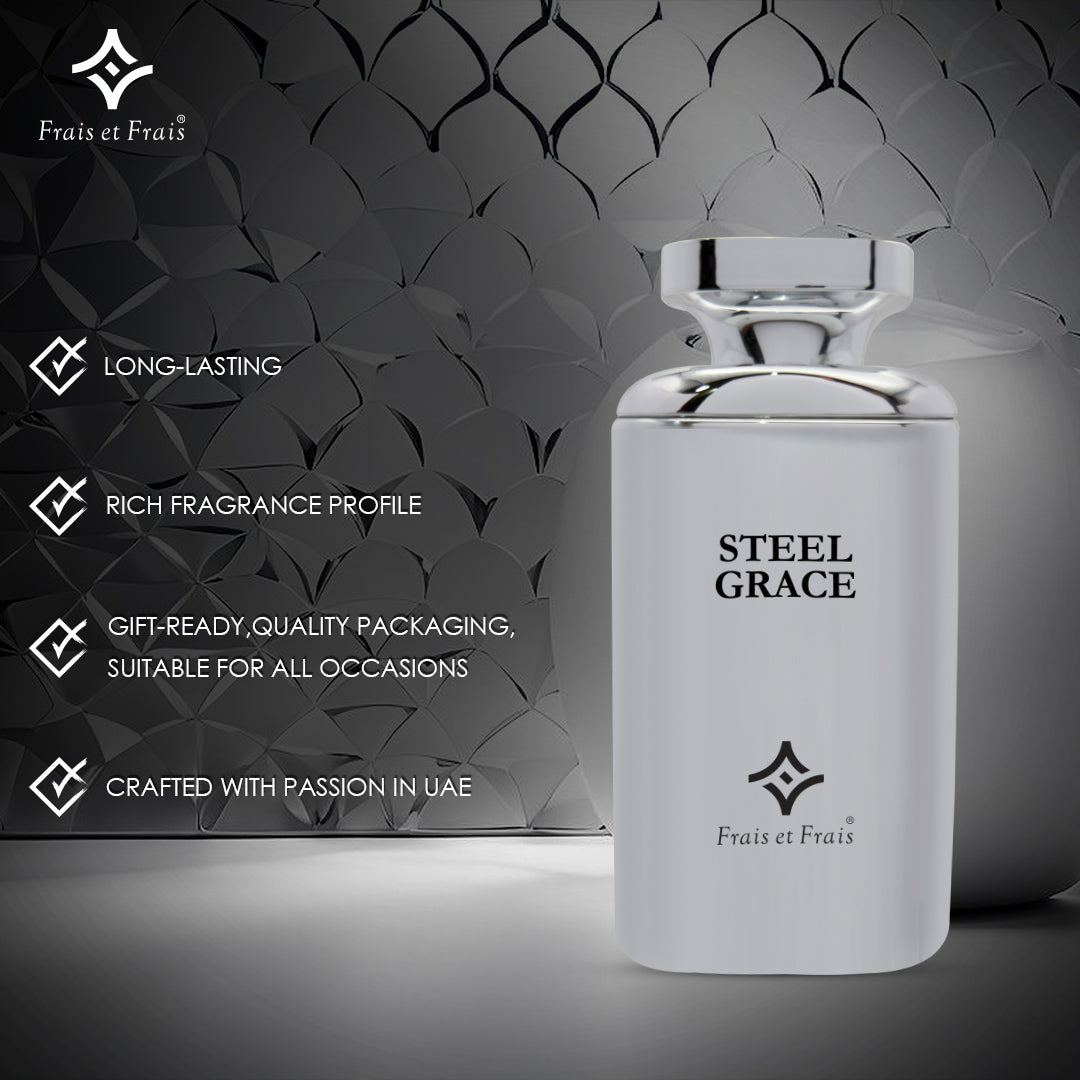 Steel Grace is a fragrance of unwavering strength and effortless sophistication, designed for men who navigate life with bold confidence. It opens with a crisp and invigorating fusion of grapefruit and marine accords, evoking the rush of an open sea and the promise of adventure. The heart introduces earthy patchouli, bay leaf, and oakmoss, grounding the scent in a masculine elegance that commands respect. As the fragrance settles, amber, vanilla, and musk woody notes weave together, creating a warm, refined finish that lingers. A scent for the man who balances power with poise, forging his own path with distinction.