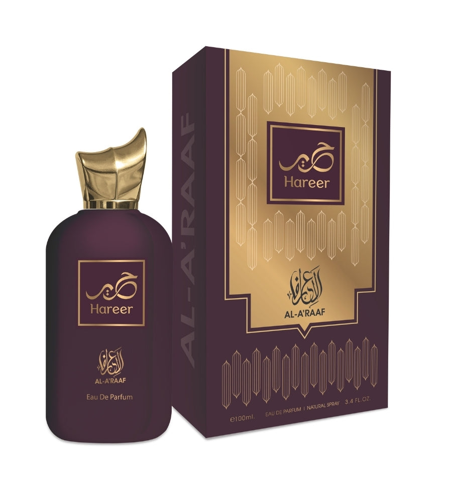 Hareer is a floral fruity gourmand fragrance designed for the modern woman. It opens with a vibrant mix of Strawberry, Raspberry, and Orange, offering a refreshing and juicy start. The heart of the fragrance features a blend of Jasmine, Violet, Rose, and Freesia, creating a fresh and elegant floral experience. The base notes of Musk, Vanilla, Amber, Moss, and Patchouli add warmth and sophistication, making it perfect for any occasion.