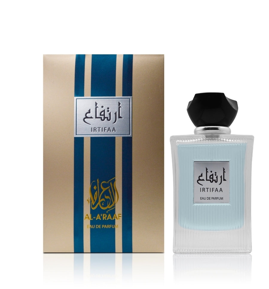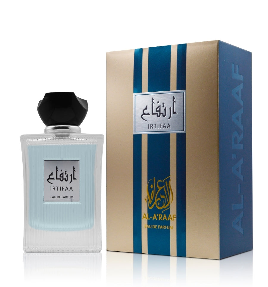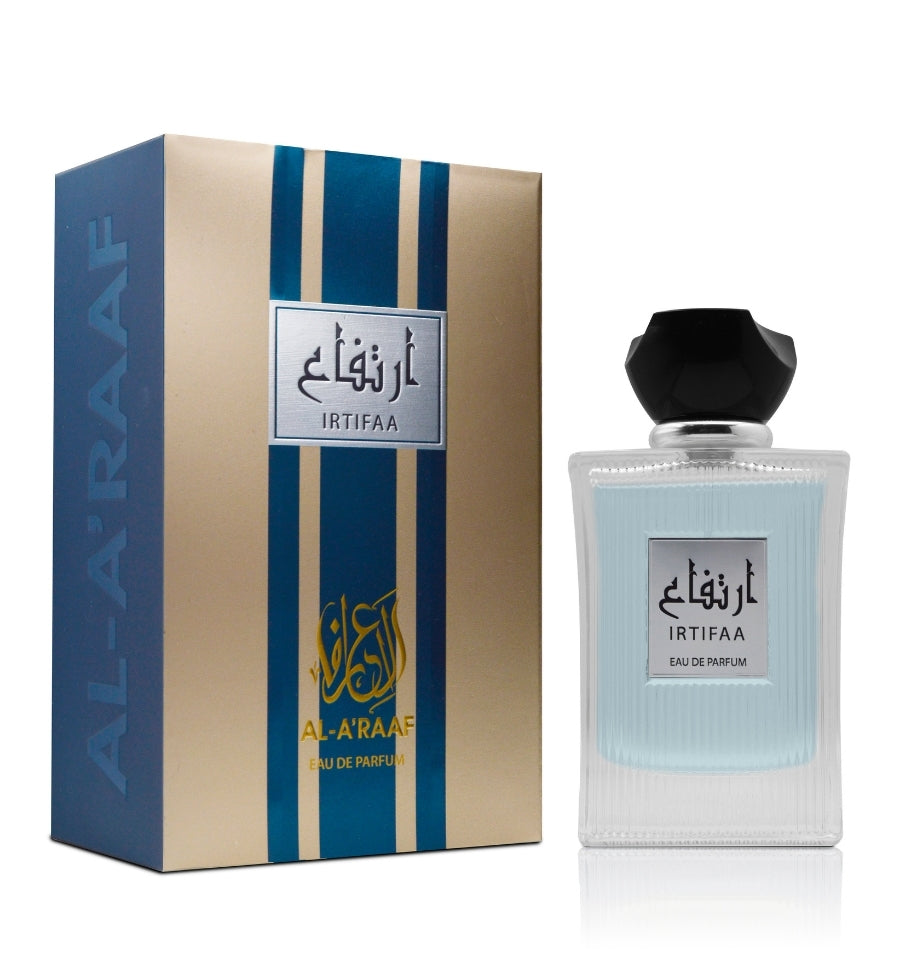 Irtifaa is a powerful amber woody fragrance that embodies strength and refinement. The top notes of Lavender, Cardamom, and Black Pepper are enhanced by the deep and smoky aroma of Incense and Patchouli in the middle. The fragrance finishes with an elegant base of Vanilla Pod and Tonka Bean, creating a scent that leaves an unforgettable impression.